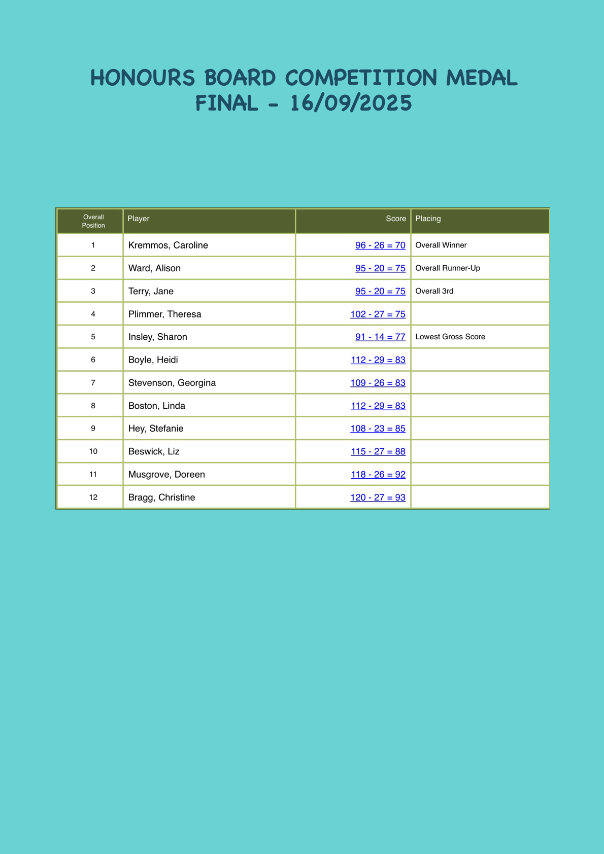 16/09/2025 – Honour’s Board Ladies Medal Final 3rd November 2025 A huge congratulations to Caroline Kremmos, winning the Ladies Medal Final for a consecutive year, with a great net score of 70